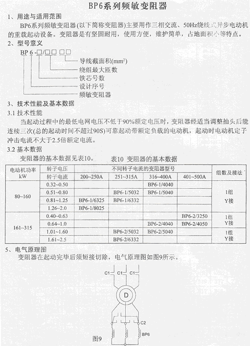 BP6系列频敏变阻器(以下简称变阻器)主要用作三相交流50Hz绕线式异步电动机的重载起动设备。变阻器是有坚固耐用,使用方便,维护简单,占地面积小等特点。
