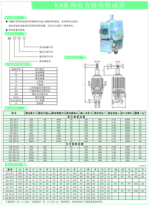 ED系列电力液压推动器主要用作YWZ4,YWZ5,YWZ8,YWZ9,YWZP系列电力液压块式制动器的操作元件,广泛适用于起重运输,冶金,矿山,港口,建筑等行业。