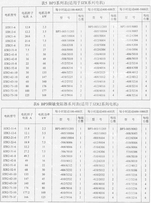 根据电机规格、操作频繁程度的不同可在表5、表6中直接查出频繁变阻器的规格及每组台数