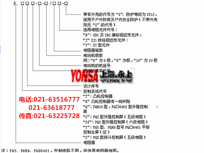 (5)控制系统代号:“T”-凸轮控制器,无一相开路;“K”—凸轮控制器,有一相开路;