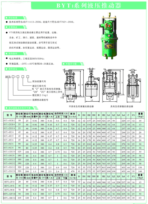 BYT1系列隔爆型电力液压推动器是一种集电机、离心泵、油缸为一体、结构紧凑的驱动控制装置,广泛用作各种块式制动器和盘式制动器的驱装置,还可用于各种工业阀门、闸门,定向摆动和转动(<90°)装置及夹紧装置的驱动控制。