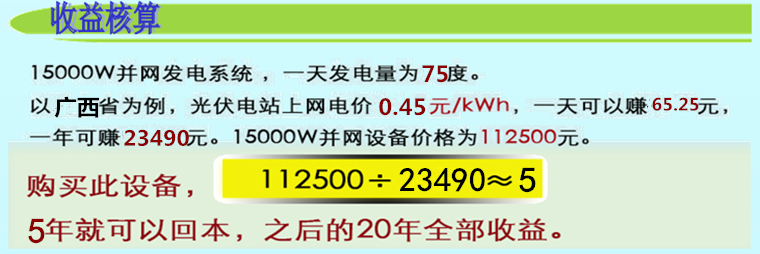 以装机容量为10KW的分布式光伏发电系统为例,总投资约10万元。南宁地区每年的有效发电时间约为1750小时(平均每天发电时间约为4.8小时),年发电量约为17500度(平均每天发电约48度)。自发自用、余电上网。光伏系统年发电量约为17500度,因此每年的收益=17500度x(0.6+0.42)元度=17850元,成本回收期≈100000元÷17850元年≈5年。30年内平均年发电量约为17000度,成本回收后净利润≈(0.4574+0.42)元度x17000度年x15年+0.4574元/度x17000度/年x10年≈30万元。