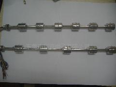 连杆浮球开关产品简介: 连杆浮球液位开关的工作原理直接、简单。通常将密封的非磁性金属或工程塑胶管内根据需要设置一点或多点磁簧开关,再将带有内置磁性系统的浮球固定在本体管内磁簧开关相关位置上,使浮球在一定范围内上下浮动,利用浮球内的磁性系统透过本体管去触发磁簧开关的闭合或断开,以产生开关动作,达到控制液位的目的。这种简单开关已得到证明的工作原理适合于各种工业状况下的液位测量。常开和常闭是没有注入液体时的状态。浮球液位开关广泛用于电子、电力、化工、水处理、给排水等各行各业的液位控制及报警。浮球液位开关分标准品和定制品,为方便用户,特别将浮球规格、材质特性、接线盒规格、接续规格及相关组件规格整理成表,以供用户正确选型。依照被测液体的使用温度、压力、比重、耐酸碱等特性,选择适合规格的浮球和导杆材质。选购时还需确定接续规格,各动作点位置,动作形式(常开或常闭)和总长等。 不锈钢连杆浮球开关