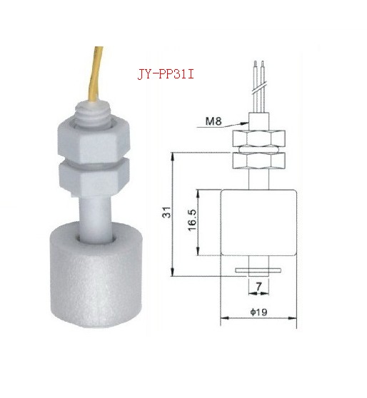 塑料浮球开关常规型号有:JY-PP25I、JY-PP31I、JY-PP40I、JY-PP44I、JY-PP52I、JY-PP73I、JY-PP85I、JY-PP100I,侧装的有JY-PL-1、JY-PL-2。