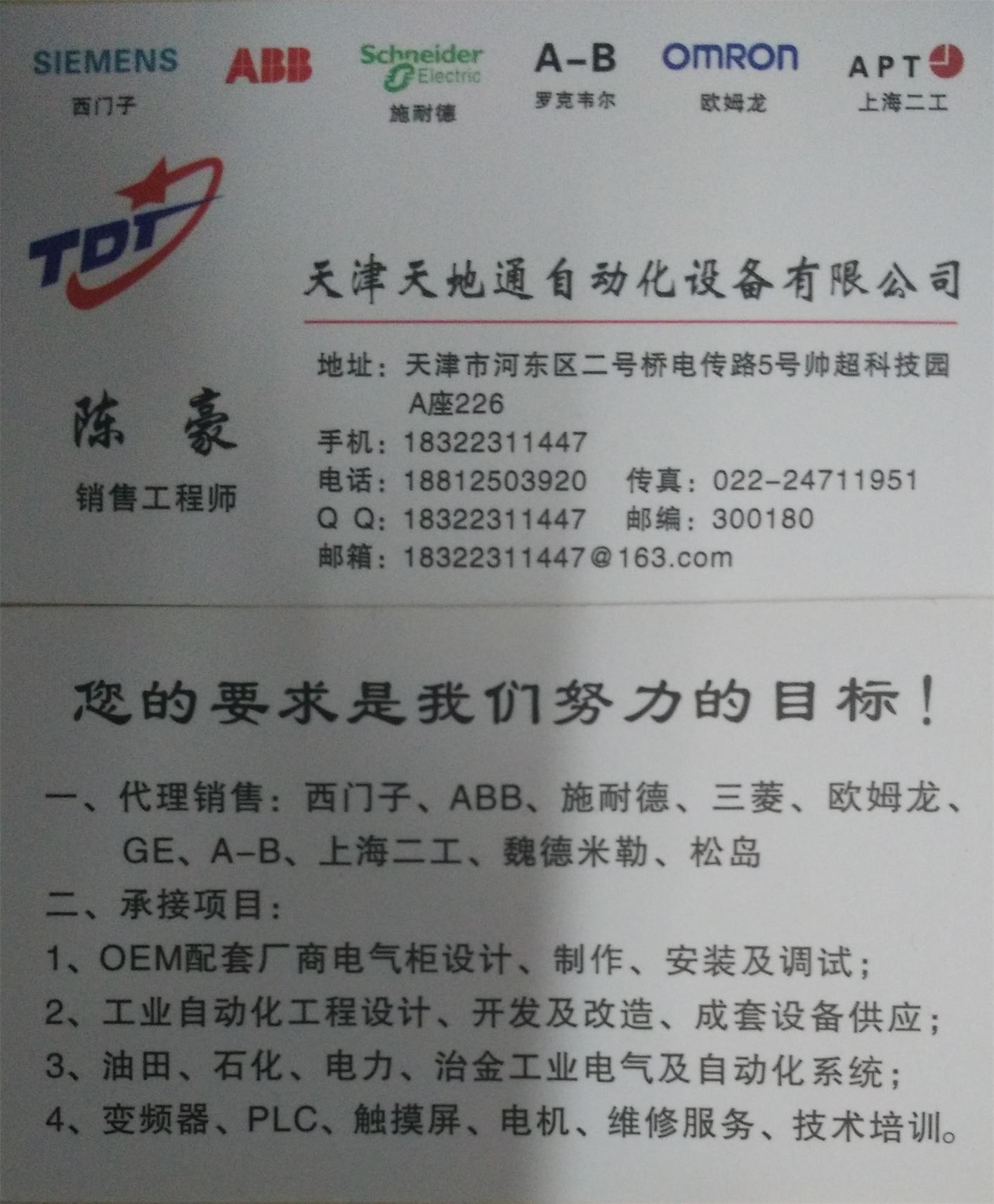亲:本司(天津天地通自动化设备有限公司)是 ABB(瑞士,芬兰)西门子(德国)、施耐德(法)、等国际品牌以等国内品牌的一级代理商、分销商。联系:18322311447。{接触器 断路器 启动器 熔断器 继电器 变频器 PLC编码器 按钮开关 导轨 DP接头 电缆 电源 电机 等产品}!