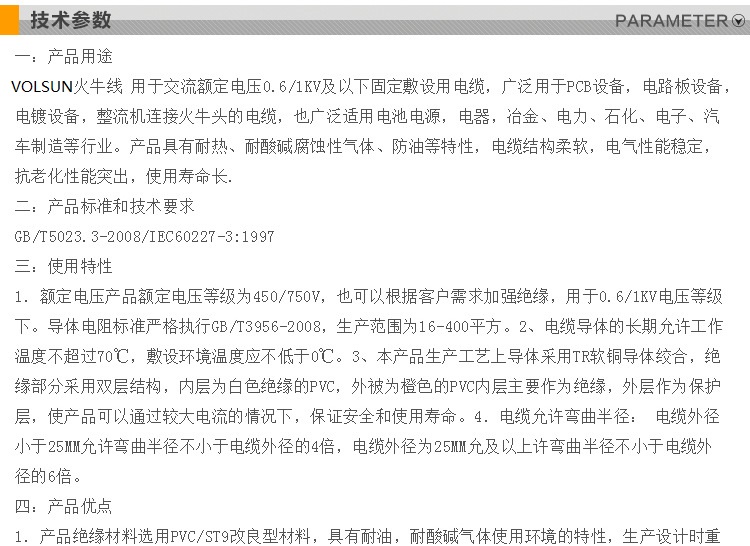 东莞市上宝电缆有限公司推荐的主导产品之一火牛线电缆,专用于电镀设备,PCB设备,自动化电镀生产线,电路板设备之上,连接火牛头及整流器上的电缆,此种电缆为双色双层绝缘,内层为白色绝缘的环保PVC,外被为橙色的抗酸碱环保PVC,耐高低温、耐腐蚀、耐油性,耐酸碱性极强。电缆其制造工艺科学,安装维护方便,我司规格从16 -240平方都常备库存现货,销售额在同行业中排名前列,是各机电电力单位,机械厂家,PCB设备维修企业的常用产品。欢迎广大客商来电来函垂询!