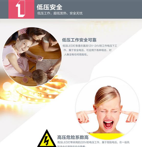 低压LED灯条是在直流12V-24V的工作电压下工作,属于安全电压