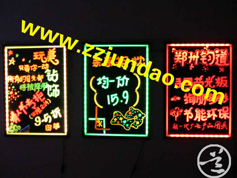 郑州钧道商贸有限公司有多种符合国际标准的手写电子荧光板出售,该产品由铝合金边框和高质量的导光板制作而成,用彩色的荧光水笔直接在导光面板上书写,通电后即可呈现出彩色霓红灯的绚丽效果,具有节能,环保,发光匀称,使用时间长等优点,是超市,酒店,车站,酒吧等公共场所宣传的理想工具。