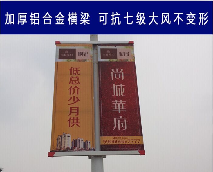 道旗的旗杆(支撑杆):目前的道旗安装旗杆支撑有普通铁质方管和圆管,也有不锈钢管和镀锌管,上下横梁多数采用铝合金旗杆,使用时限长,可多次拆卸,易于加工。