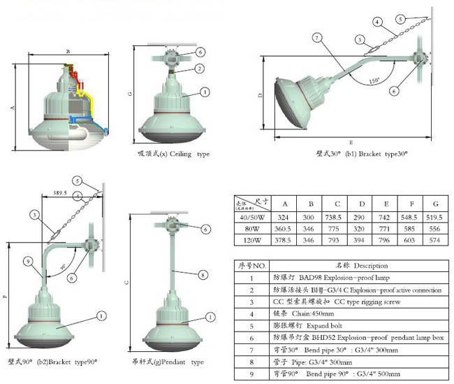 5. 配用光源:电磁感应灯(无极灯): 40W, 50W 80W, 120W, 150W