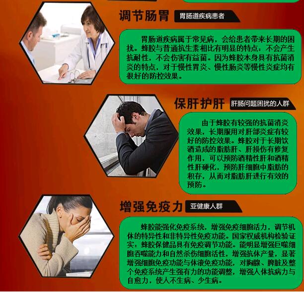 因此,蜂胶对糖尿病患者的治疗和保护作用是多种因素共同起作用的结果,而且,蜂胶对糖尿病忠者的保护作用是多方面的。而且蜂胶天然无毒、强化免疫、排毒杀菌、抗氧化、净化血液、保护血管、预防多种并发症,服用蜂胶制品对糖尿病患者具有非常重要的意义。