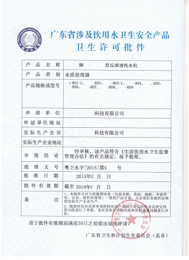 国家对饮用水水质净化设备等涉及饮用水卫生安全产品实行严格的卫生许可制度管理,对企业生产出来的饮用水净化设备按照规定程序进行卫生安全检测和评价。经严格的卫生安全检测后,符合卫生安全要求的产品,由省级以上卫生行政部门核发《涉及饮用水卫生安全产品卫生许可批件》才能上市销售。