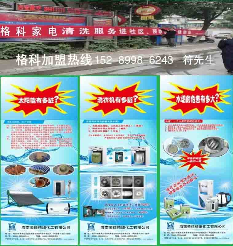 格科家电清洗全国连锁品牌目前全国招商。提供给代理商产品销售+清洗服务操作市场模式。目前公司不收取任何形式的加盟费、保z金、代理费。达到一定的首批订货要求,即可按产品、按区域灵活授权。并提供完善的区域保护以及售后支持。欢迎来电咨询……
