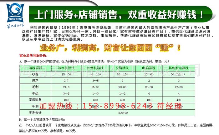 一、格科家电清洗项目——最有前景、市场巨大的项目。从而也提供了一个很好的发展机会和空间!