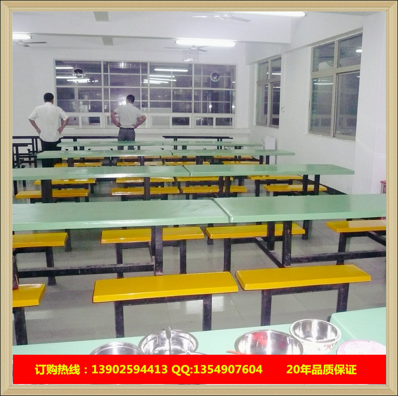 玻璃钢餐桌椅主要类型:四人圆凳、六人圆凳、八人圆凳、十人圆凳;四人条凳、六人条凳、八人条凳、十人条凳;四人靠背、六人靠背、八人靠背、十人靠背;规格尺寸:整体尺寸:长2000*宽1350*高750MM;桌面尺寸:长2000*宽600MM;条凳尺寸:长2000*宽225MM也可按客户要求订做餐桌椅材质:餐桌椅台面利用高密度板制基材纤维玻璃钢所制,餐桌椅支架一般为47*47*1.0厘厚铁方管制造,黑色油漆。质量有保证..产品色板:大红、桔红、桔黄、中络黄、柠檬黄、奶黄、深兰、罗兰、天兰、美术绿、果绿、湖绿、宝绿、白色、浅灰、象牙色、黑色、啡色、嫩绿、深灰、米白、米黄、肉黄、白橡木、金橡木、灰防火板等。颜色有多种,可供选择。玻璃钢食堂餐桌椅、学生食堂餐桌椅、职工食堂餐桌椅专业生产厂家柏克,凭借桌越的品质、完善的功能、周到的服务, 深受广大用户的信赖与赞扬,欢迎您来电咨询和定购。 按款式可分为:连体餐桌椅、分体餐桌椅、圆凳餐桌椅、条凳餐桌椅、靠背椅餐台,圆桌餐台椅 按规格可分为:二人餐台、四人餐桌椅、六人餐台椅、八人餐桌椅、十人餐台椅。 四人整体尺寸:长1100*宽1400*高750毫米;桌面尺寸:长1100*宽600毫米;条凳尺寸:长1100*宽225毫米 六人整体尺寸:长1500*宽1400*高750毫米;桌面尺寸:长1500*宽600毫米;条凳尺寸:长1500*宽225毫米 八人整体尺寸:长2000*宽1400*高750毫米;桌面尺寸:长2000*宽600毫米;条凳尺寸:长2000*宽225毫米 十人整体尺寸:长2400*宽1400*高750毫米;桌面尺寸:长2400*宽600毫米;条凳尺寸:长2400*宽225毫米 台面及凳椅面颜色可自行选择,支架一般为50*50*1.0厘厚。 方管喷黑色漆。各种台面、凳椅面可随意搭配。