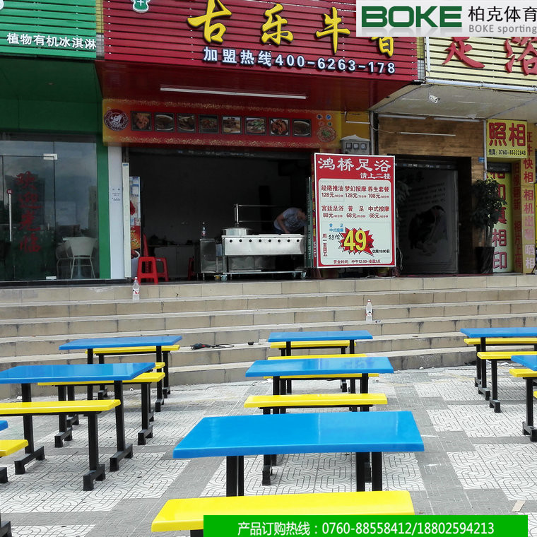 我的产品介绍: 桌椅尺寸食堂餐桌椅的常见尺寸参考,(1)餐桌高:750—790mm;(2)餐椅高;450—500mm;(3)圆桌直径:二人500mm,二人800mm,四人900mm,五人1100mm,六人1100-1250mm,八人1300mm,十人l500mm,十二人1800mm;(4)方餐桌尺寸:二人700×850(mm),四人1350×850(mm),八人2250×850(mm);(5)餐桌转盘直径;600—800mm,餐桌之间距离:(其中座椅占500mm)应大于500。 食堂餐桌椅- 质量 在食堂餐桌椅的生产中,材料的质地和肌理决定了产品的外观质量的特殊感受。木材属于天然材料,纹理自然、美观,形象逼真,手感好,且易于加工、着色,是生产食堂餐桌椅的上等材料。塑料及其合成材料具有模拟各种天然材料质地的特点,并且具有良好的着色性能,但其易于老化,易受热变形,用此生产家具,其使用寿命和使用范围受到限制。 食堂餐桌椅- 流行趋势 目前板式餐桌椅和钢木结合餐桌椅占据家具市场的80%以上。餐桌椅的出口主要以欧洲时尚流行款式为主,并且折叠式的更受欢迎,更易出口。