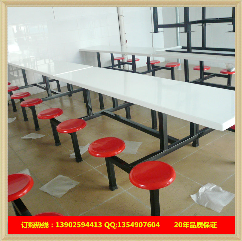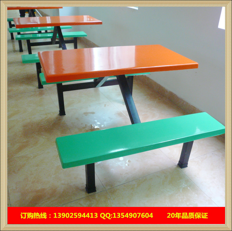 1.材质:桌面,优质玻璃钢。椅面,优质玻璃钢。桌架,主体架50*50*1.2管,经去油防锈,高温静电喷塑处理。此产品可定做4人/6人/8人/10人,桌面/椅面颜色可自选。