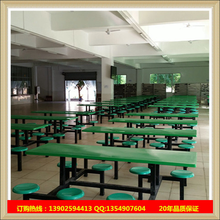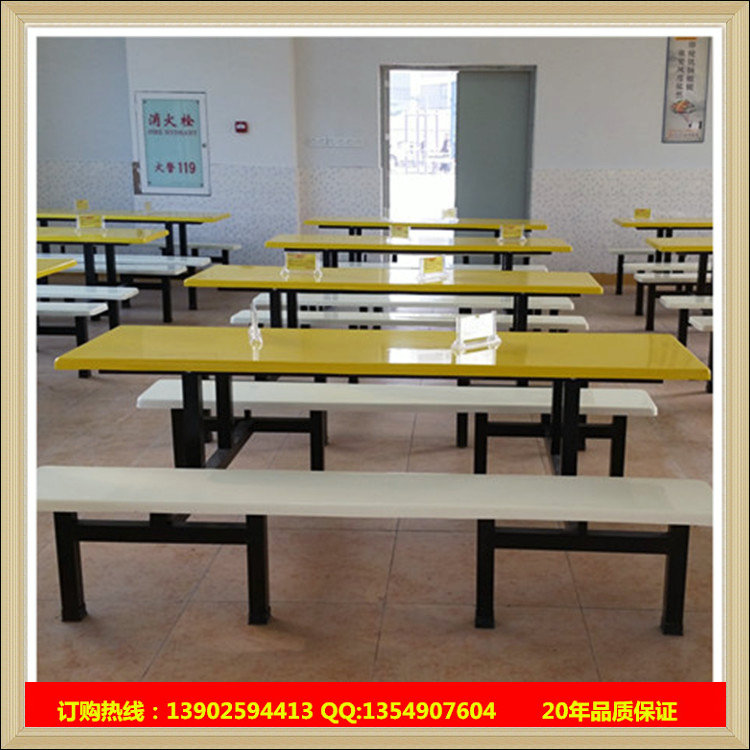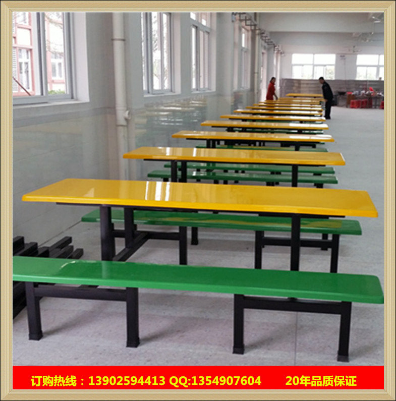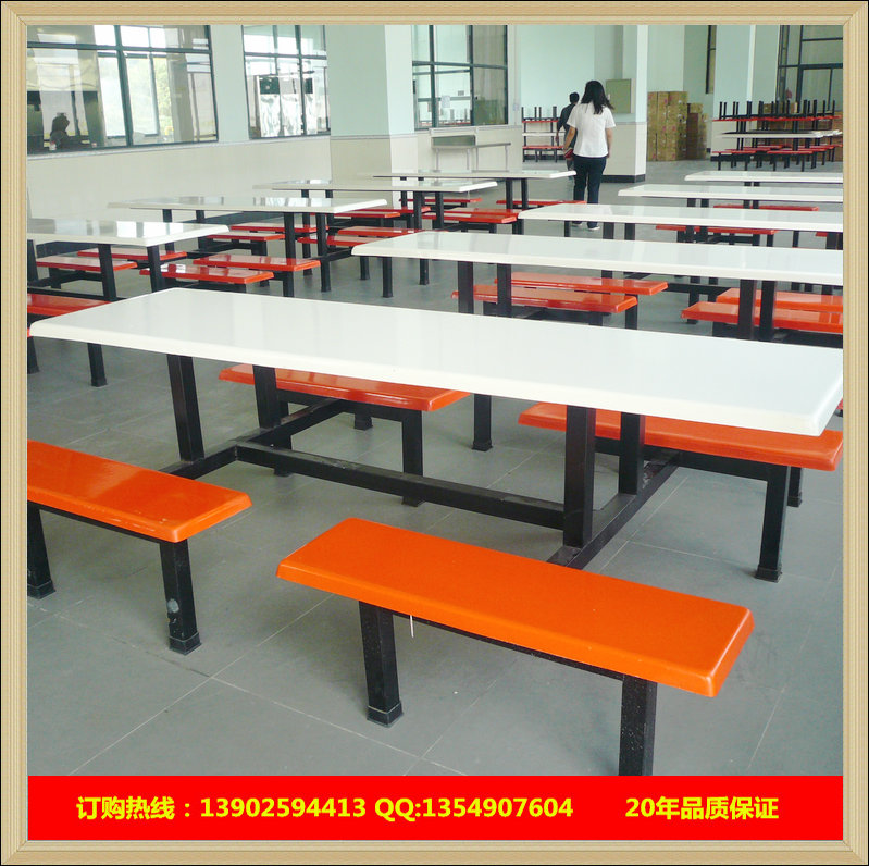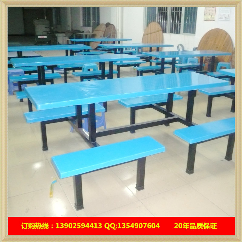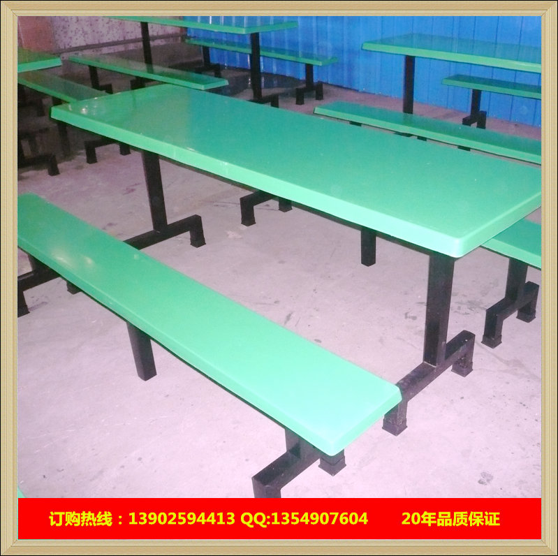 食堂餐桌椅桌面外表为胶衣层,外表光滑、一般刚生产出来的桌面由于该桌面是脱模而成的、一般表面上都还有腊的成份因而不怕水、所以在就餐完后可用湿布来擦、而反面由刨花板压制而成、然后封上纤维布、刨花板遇水容易膨胀而散、所以一般桌面装好后反面一定不能受水。