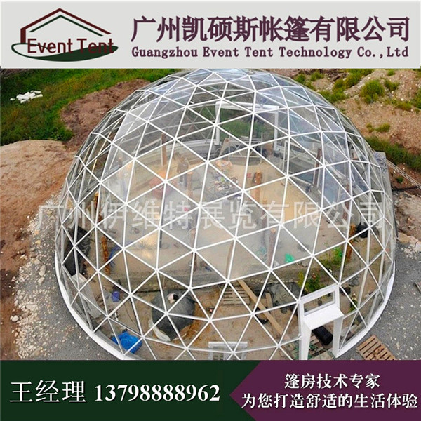 深圳透明圆顶球形篷房帐篷由特制高强度钢管,表面镀锌或喷漆(颜色可自由选),篷顶为PVC篷布(颜色可自由选),可配套玻璃门,尺寸直径为8m,10m,15m,20m,25m,30m,最大可以做到75米。(我司为国内首家专业制造厂家)