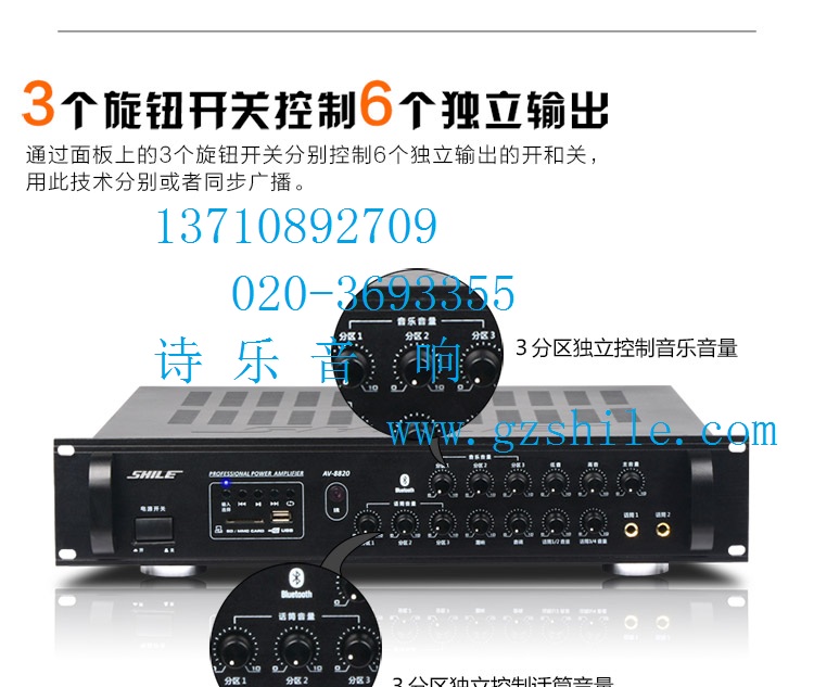 AV8820(3分区6声道功放)+ BX105 (6只音箱) + SH18 U段无线麦克风