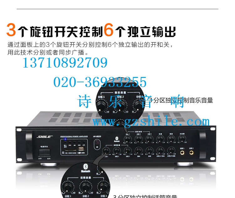 AV8820(3分区6声道功放)+ BX105 (6只音箱) + SH18 U段无线麦克风