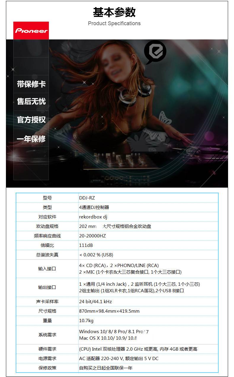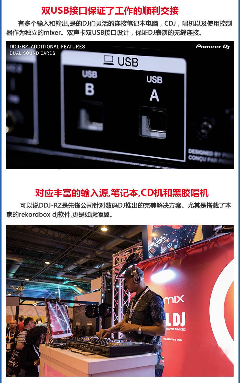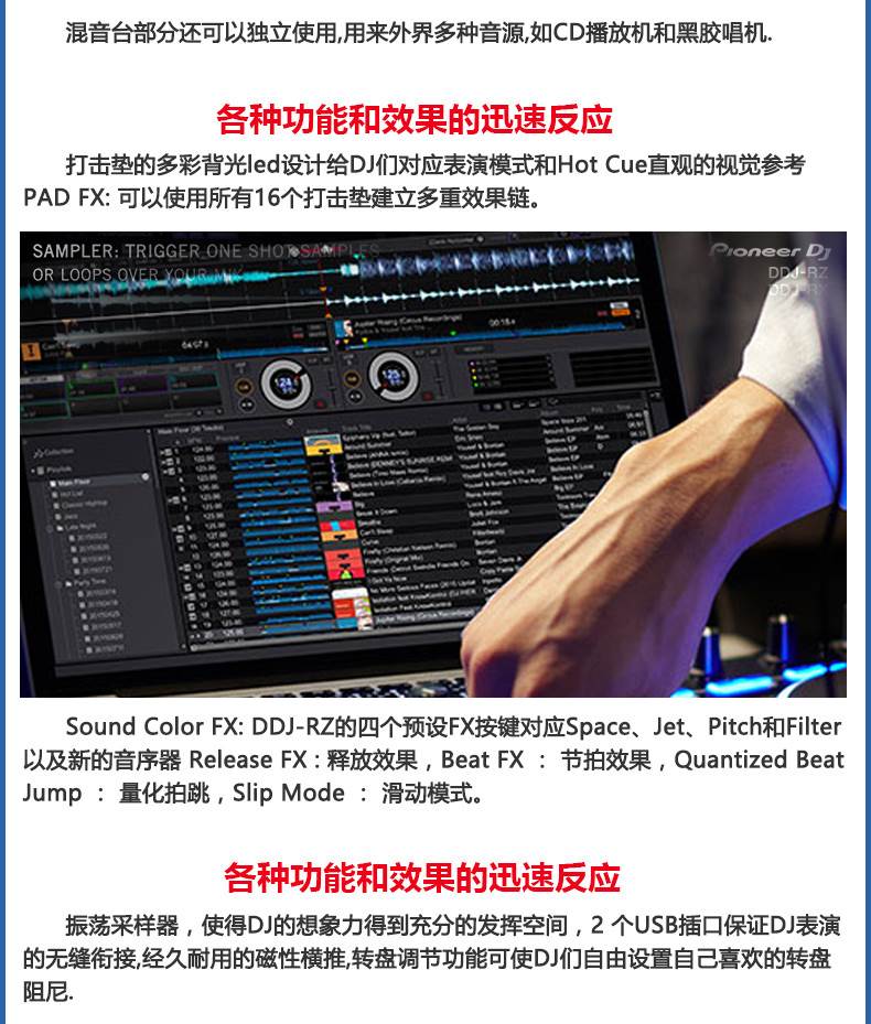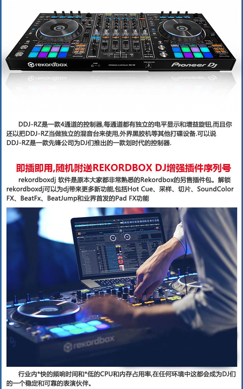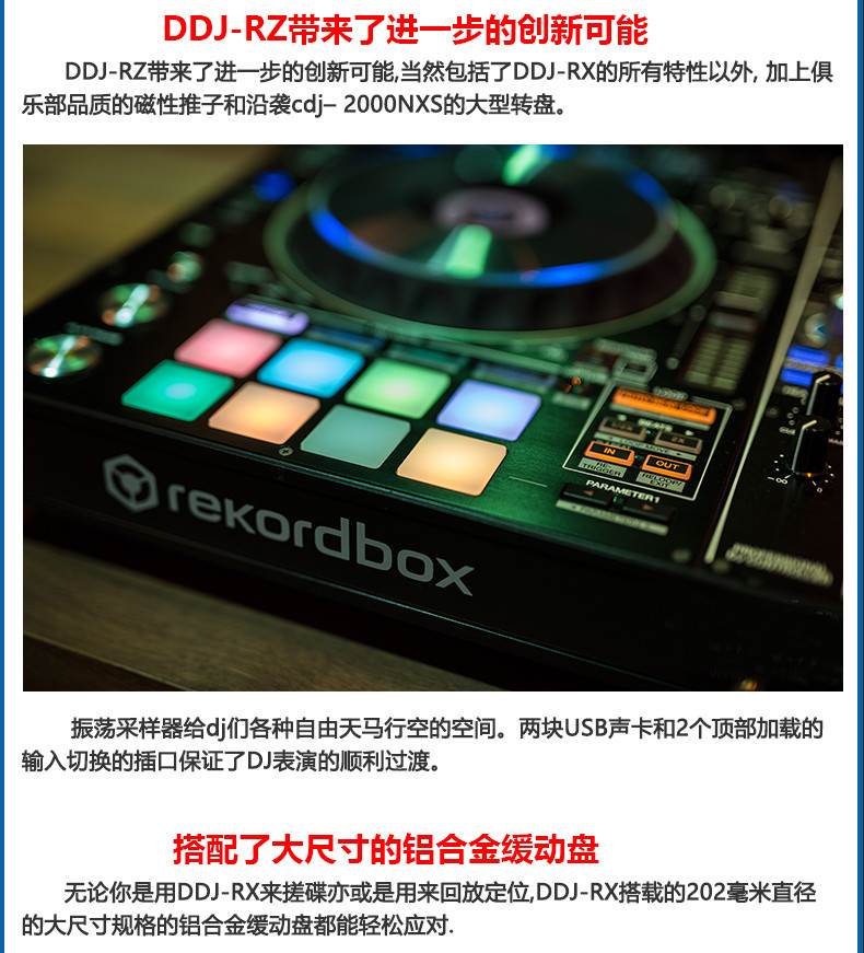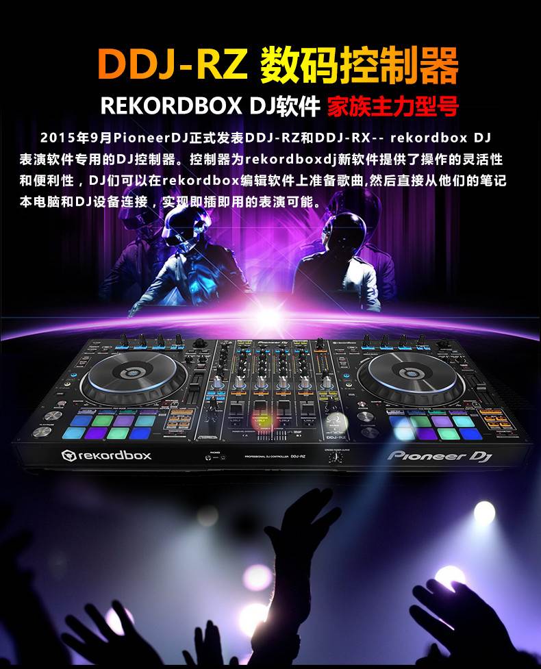 Rekordbox DJ表演软件专用的DJ控制器。控制器为rekordboxdj新软件提供了极的灵活性和便利性,DJ们可以在rekordbox编辑软件上准备歌曲,然后直接从他们的笔记本电脑和DJ设备连接,实现即插即用的表演可能。