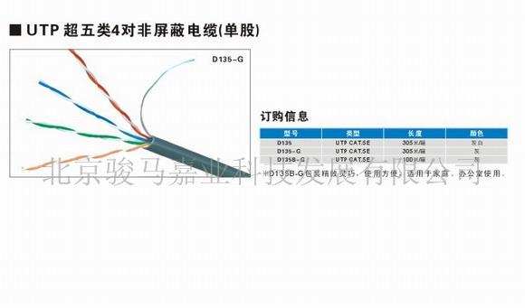 电缆/双绞线:超五类非屏蔽双绞线を性能概述:环路电阻(20℃):160欧姆/公里容抗:42pF/m 阻抗:100欧姆±15欧姆传输阻抗(1/10/30MHZ):<45/90/190豪欧传输延迟:9ns/100m NVP:76% 具有高品质电气及机械性能的超五类数据铜缆,满足高端需求。借助于屏蔽铝箔,达到非常好的屏蔽效果;兼容目前所有的连接硬件,根据标准:EN50173和ISO/IEC11801
