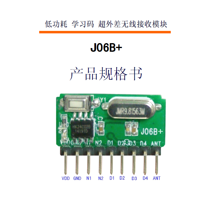 J06B是一款低功耗,低成本,小体积,带解码(学习码)超外差无线接收模块,采用高性价比无线数据接收芯片及低功耗单片机,接收灵敏度-106dbm,数据解调带宽为5K,可兼容PT2262 PT2260及1527编码,可学习PT2262 PT2260及1527编码遥控器。模块具有锁存和非锁存选择端口,4路输出,解码输出高电平,用户可直接替换原来的接收模块+解码芯片方案来降低产品成本,缩小产品体积。同时模块具有低功耗模式选择端口,当工作在低功耗模式,模块自动处于休眠与唤醒状态来检测和接收信号,当检测到有效信号立即进入接收模式处理数据,工作电流为2.5mA,进入休眠模式,平均待机电流只有0.2mA,以延长用户产品的电池寿命。用户可使用3-5V电源。
