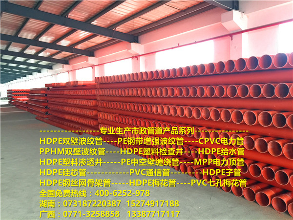 市政工程管道包括:钢带增强聚乙烯(PE)螺旋波纹管、HDPE中空壁缠绕管、HDPE双壁波纹管、PVC-U双壁波纹管、(PVC—C)高压电力电缆套管、PVC-U埋地用通信管道、PE顶管、PVC梅花管、PE梅花管、HDPE硅芯管、PE子管、玻璃钢夹砂管、玻璃钢电缆保护管、HDPE给排水管、PE燃气管等; 民用管道包括:(PVC—U)给排水管材(管件)、绝缘电工套管、、PVC-U给排水管、PP-R冷热水管、F-PPR冷热水管等; 塑料检查井共计200多个规格型号,年生产能力达30万吨以上,年产值可达20亿元以上。