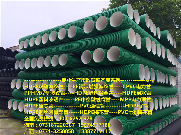 产品系列关键字:HDPE双壁波纹管,HDPE钢带增强螺旋波纹管,HDPE中空壁缠绕管,HDPE给水管,PVC通信管,多孔梅花管,CPVC高压电力套管,塑钢缠绕管排水管,HDPE子管