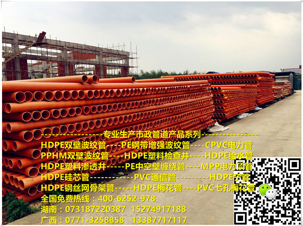 产品系列关键字:HDPE双壁波纹管,HDPE钢带增强螺旋波纹管,HDPE中空壁缠绕管,HDPE给水管,PVC通信管,多孔梅花管,CPVC高压电力套管,塑钢缠绕管排水管,HDPE子管