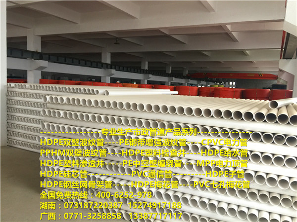市政工程管道包括:钢带增强聚乙烯(PE)螺旋波纹管、HDPE中空壁缠绕管、HDPE双壁波纹管、PVC-U双壁波纹管、(PVC—C)高压电力电缆套管、PVC-U埋地用通信管道、PE顶管、PVC梅花管、PE梅花管、HDPE硅芯管、PE子管、玻璃钢夹砂管、玻璃钢电缆保护管、HDPE给排水管、PE燃气管等; 民用管道包括:(PVC—U)给排水管材(管件)、绝缘电工套管、、PVC-U给排水管、PP-R冷热水管、F-PPR冷热水管等; 塑料检查井共计200多个规格型号,年生产能力达30万吨以上,年产值可达20亿元以上。