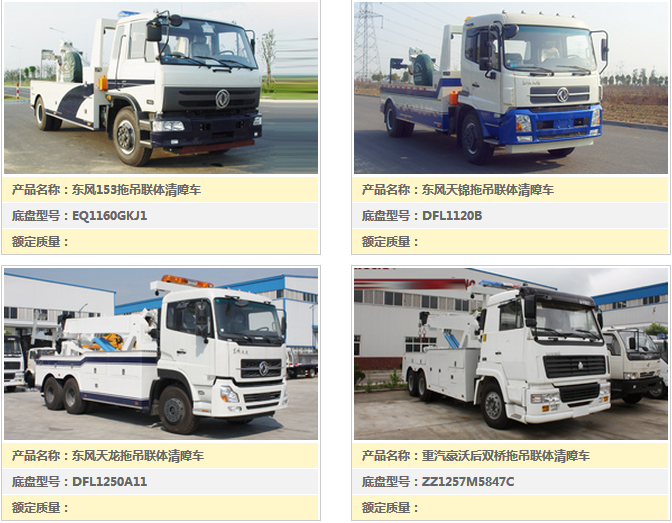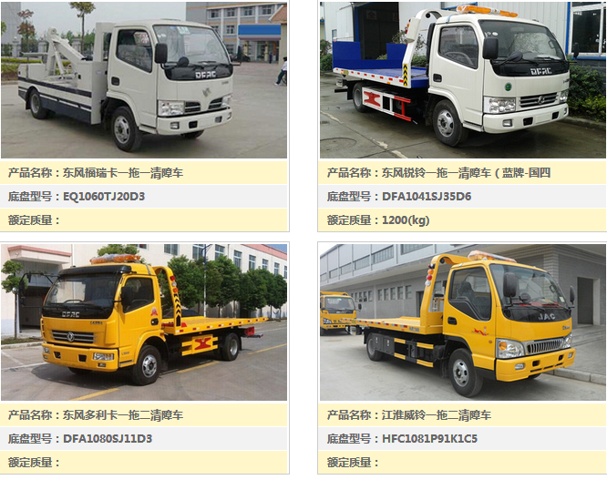 本公司为您提供:2吨,3吨,5吨,8吨,10吨,15吨,25吨,30吨,50吨,60吨。江淮清障车,五十铃清障车,五十铃平板救援车,东风锐铃平板清障车,东风小霸王一拖一施救车,东风多利卡清障车,东风多利卡托吊型清障车,东风153一拖一施救车,东风平头道路清障车,东风天龙后八轮大型救援车。红岩重型清障车,斯太尔大型清障车,斯太尔重型清障车,平板清障车,依维柯清障车等等应有尽有。