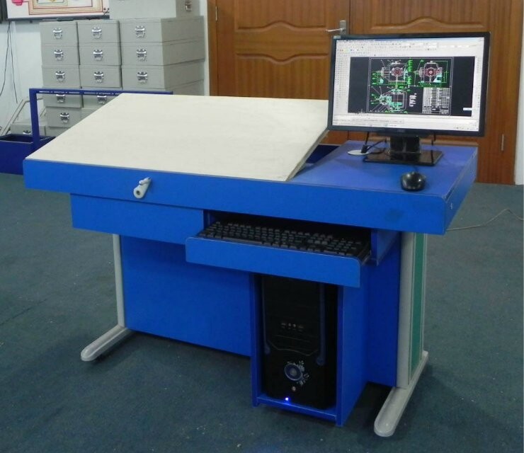 工程绘图桌是根据制图课学习的要求设计的,符合人体工程学,设计新颖,稳定可靠,功能齐全。板面斜度具有0-40度范围可调, 转动手柄即可调节面板倾角,传动部分为中碳钢和铝合金材质的螺旋传动,坚固耐用。台面下的抽屉可放文具、资料等。右边可放置电脑,是一款具有手工画图和电脑做图的一体化工程制图桌。是各大院校的理想首选制图实验室设备。