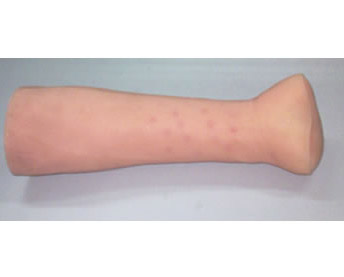 仿真手臂共有8个部位进行皮试注射练习。如果液体注射正确,皮肤上就会出现皮丘,抽出液体后皮丘就会消失,并有几个皮试红晕色深浅、消失进行对比。