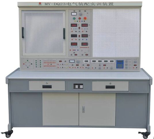 一、MY-DQ23电气装配实训装置概述:本装置由钢板作制作的多功能安装板(网孔板)实训台和电源装置等组成。实训时选择的各种元件、器件和部件,可方便地安装在网孔板上,方便灵活。根据教学和实训的需要,选择不同的元件、器件和部件,可进行不同课程模块,不同项目的实训,电气装配实训装置适用范围广,可完成的教学内容和实训项目多。使用完毕的元件、器件和部件,从实训台上拆下,集中保管,损坏和丢失少。一个实训场所,可以完成几个专业教学和实训,经济适用。实训台配备漏电保护、过载和电路保护,保障人身安全和设备使用安全。灵活、可靠、安全、经济适用,电气装配实训装置的特点。对实训场所不多、教学经费投入受限制的学校,本装置是一种理想的职业教育实训设备。