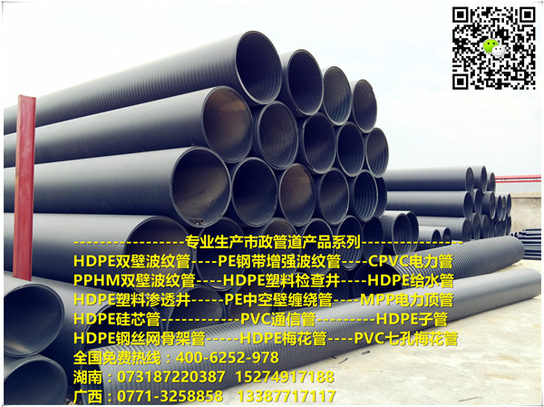 产品系列关键字:HDPE双壁波纹管,HDPE钢带增强螺旋波纹管,HDPE中空壁缠绕管,HDPE给水管,PVC通信管,多孔梅花管,CPVC高压电力套管,塑钢缠绕管排水管,HDPE子管