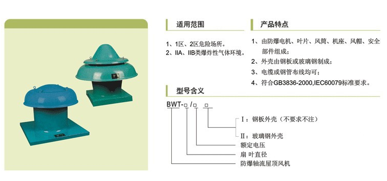 7、适用面广:本风机可以根据使用要求,制作成防爆型、防腐型、适用于易燃、易爆及有腐蚀性气体的场合的强制排风;