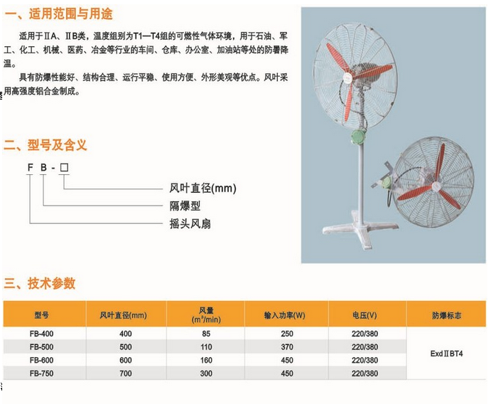 FB系列防爆摇头风扇其防爆性能符合GB3836.1《爆炸性环境用防爆电气设备通用要求》和GB3836.2《爆炸性环境用防爆电气设备隔爆型电气设备“d”》的规定,制成隔爆型,防爆标志为dⅡBT4,其防爆性能经国家指定的防爆电气产品质量监督检验单位全面测试合格,取得了防爆合格证。