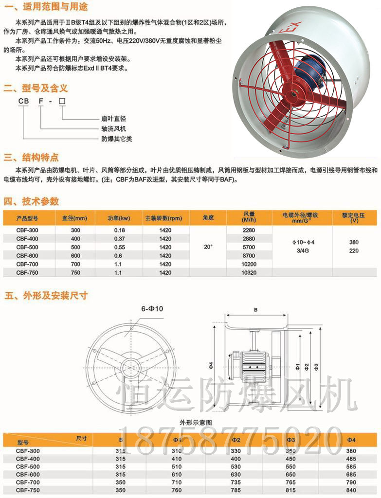 三、CBF-500防爆轴流风机固定式 500MM固定式防爆风机产品特点: