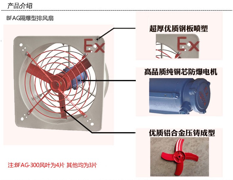 BFAG系列厂用隔爆型防爆排风扇主要由框架、风叶和防爆电机组成,主要适用于易燃易爆环境中的排风使用,扇叶直径从300-600mm不等,电机功率根据扇叶直径分别为0.12-0.37KW。