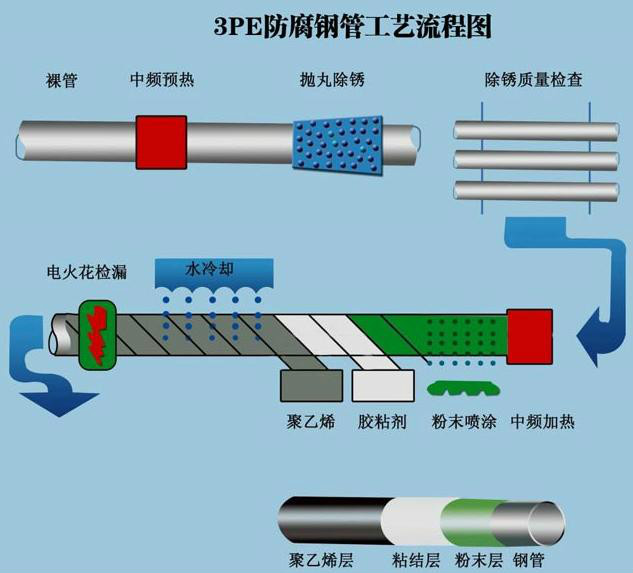 三种粉末涂装3PE防腐涂层过程为:钢管表面处理(除锈)→中频加热→环氧粉末静电喷涂→中间胶粘剂粉末涂装→聚乙烯粉末涂装→流平→冷却定型。