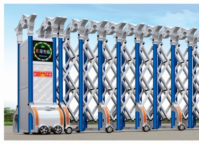 2、伸缩门无轨系统采用微型计算机控制系统及先进的导航技术,在无任何轨道的情况下均能按预定路线行驶,在行驶过程中如受外力影响而使机头完全偏离预定路线时,它会自动检索预定路线、自动纠错,保证门体按预定路线行驶。