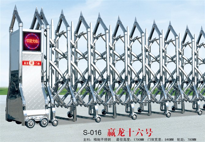 伸缩门主要用于工厂、企业、政府机关、生活小区、学校、庭院等等。 2. 赢龙伸缩门一般高度:1600mm~~1800mm。别墅专用门我们可以做到:1300mm.。 3.本公司取用质量最好的威捷伸缩门专业电机,大大提高使用年限,伸缩门寿命可达十年以上。 4.机头配置双显示屏,前屏是非常高档的滚动显示达600字的宣传,可以提升企业形象、宣传企业文化,从而达到良好的广告效应。后屏是固定字,显示如“欢迎光临”这些字,使客户有宾至如归感觉。 5. 防雷击保护:限位输入采用防雷击保护电路,防止因输入引线太长而遭雷击故障。 6. 本公司通过专业设计能抵御强风。如需订做防八级台风以上的伸缩门,请致电赢龙伸缩门全国直销电话。 7. 每一款赢龙伸缩门都配置专业红外线防碰撞控头,它在前进过程中如遇障碍物,可自动停止并后退。这样使客户在使用时更安全方便,有保障。