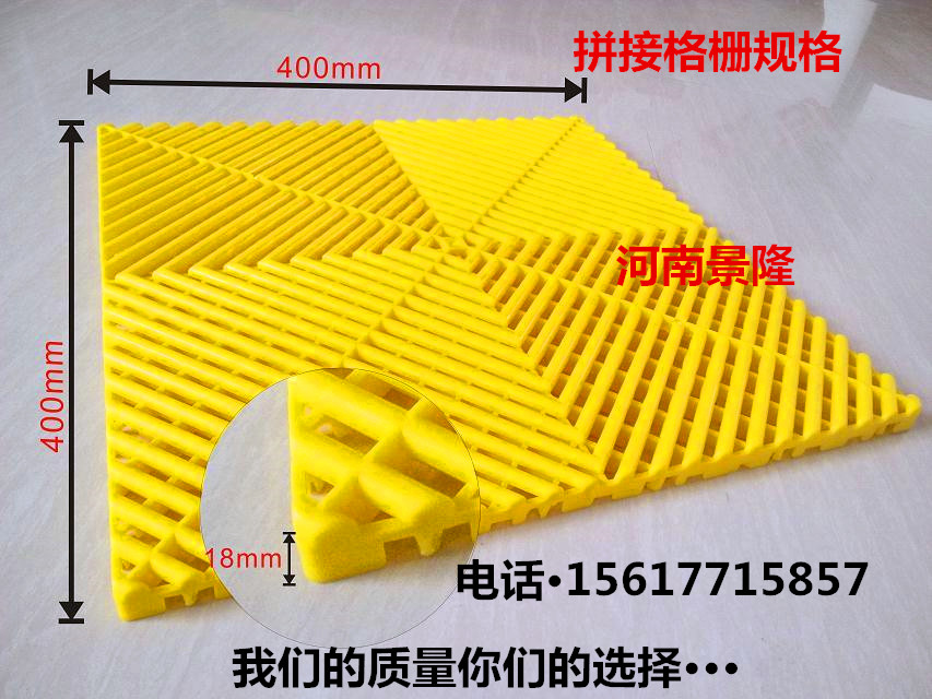 多彩拼接格栅洗车房拼接格栅防滑随意拼接格栅地毯 规格报价咨询电话或加微信15136173132,QQ:1841867117 王经理 1、高分子塑料拼接格栅洗车拼接格栅塑料排水篦子产品说明: 颜色:红黄绿灰黑白等 材质:高分子复合材料 规格:400*400mm 地板厚度:18mm 性能:超级耐磨,防滑,排水,承重强,装饰效果好。 适用范围:卫浴场所,洗车行、游泳池、会展中心、户外展示等。 2、高分子塑料拼接格栅洗车拼接格栅塑料排水篦子产介绍: ①高分子塑料拼接格栅规格:400*400*18,承重可达3吨,是专门用于洗车房地面,卫浴等场所的格栅品种,这种格栅不仅质地轻盈,拼接、移动方便,还能有效起到防滑、防湿以及美观的作用。 ②高分子塑料拼接格栅与洗车房玻璃钢格栅配合使用,能够协调整个布局,让洗车房更上档次。高分子塑料拼接格栅安装方面,锁扣对其连接即可使用,无需后期维护,一次投入,终身受用。 ③高分子塑料拼接格栅质地优良,长时间使用亦不变形、不褪色。 为了迎合现代化地砖的风格及规格,这种格栅4块拼接就相当于一块标准地板砖的尺寸,可以更少的减少料损 【效果展示图】 【细节展示】 导购推荐