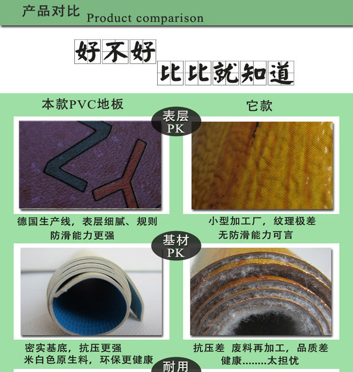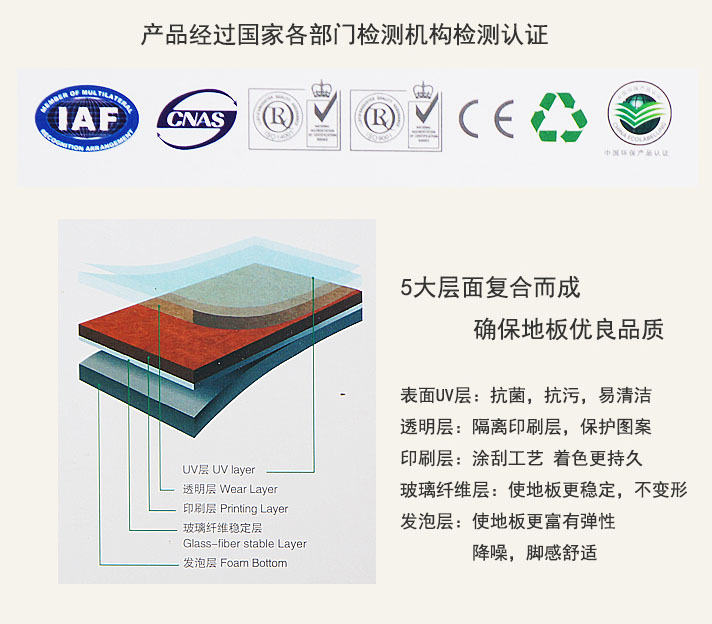 1、 质轻:一般PVC地板重量为2-3公斤/平米,不足普通地面的10%,在高层建筑中对于楼体承重和节约空间有着无可比拟的优势。2、 环保:一般PVC地板的主要原料是聚氯乙烯,它是环保无毒的可再生资源,相对于木地板的甲醛等有害物质,其环保性能有着绝对的优势。3、 高弹、抗冲击:PVC地板质地柔软,所以弹性很好,在重物冲击下有着良好的弹性恢复,所以能大大减少人员的滑到摔伤,同时对重物的冲击破坏也有良好的弹性恢复,不会造成损坏。4、 防滑:PVC地板有与水即涩的特性,同时一般PVC地板都做了防滑处理(耐磨层花纹)5、 防水:PVC地板主要成分是聚氯乙烯,所以自然不怕水,只要不长期浸泡就不会损坏。6、 吸音:PVC地板吸音可达20分贝,所以在需要安静的环境如医院病房、图书馆、报告厅等地选用PVC地板,就不用再为高跟鞋的响声而烦恼。7、 花色繁多:PVC地板可以加工成众多的颜色和花纹,所以使用者的花纹的可选择范围更广泛,可以实现个性化定制。8、 施工安装简便:较好的美工刀就可以任意裁剪,施工可以简单拼接,也可以无缝焊接。9、 超高性价比:比专业木地板价格便宜很多,但性能更卓越。