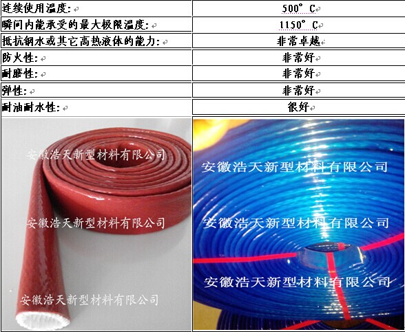 耐高温套管以高膨松性玻璃纤维之套管所制成,并覆以厚实的氧化铁红硅胶,其能阻挡熔铁喷溅,且不受高温和火焰所损坏,这些特性使其适用于保护恶劣环境下的软管、缆线和管路。可连续暴露于260度的高温中而不受损坏,在高达1090度的温度下可承受15-20分钟,1650度的温度下则可承受15-30秒钟
