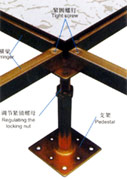 全钢OA智能化楼宇架空地板系统由地板、支座、防震垫、螺钉组成,地板放置在带有防震垫的铝头支座上,螺钉穿过地板四周的角锁孔直接连接在自身高度可调的钻头支座上。