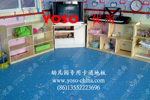 YOSO幼儿园室内专用PVC地板100%纯PVC耐磨层,厚度达1.5mm,并经防老化和紧固技术处理,耐磨耐压,使用寿命可达6年。 幼儿园室内专用PVC地板的玻璃纤维补强网和特殊网格布纤维加强层起到稳定场地尺寸、延长使用寿命的作用,使地板永不收缩,性能更加稳定。
