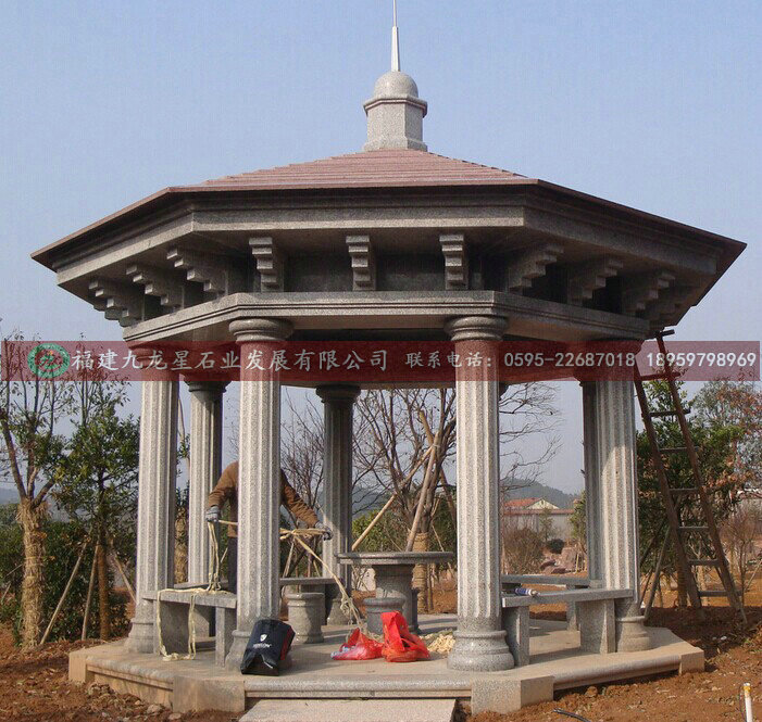 石亭子是指用石头加工而成的亭子,多建于路旁,供行人休息、乘凉或观景用。石亭子一般为开敞性结构,没有围墙,顶部可分为六角、八角、圆形等多种形状。其材质多选用青石、花岗岩等。园中设亭,关键在位置。如上所说,亭是园中“点睛”之物,所以多设在视线交接处。如苏州网师园,从射鸭廊入园,隔池就是“月到风来亭”,形成构图中心。又如拙政园水池中的“荷风四面亭”,四周水面空阔,在此形成视觉焦点,加上两面有曲桥与之相接,形象自然显要。
